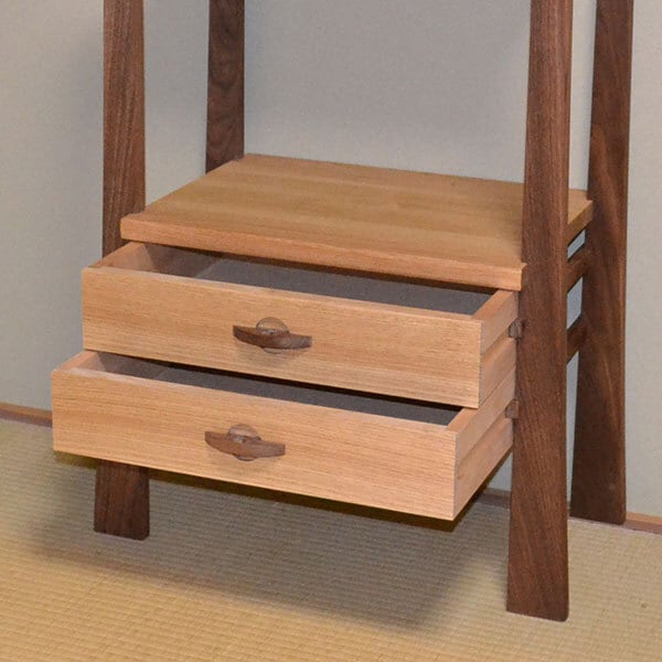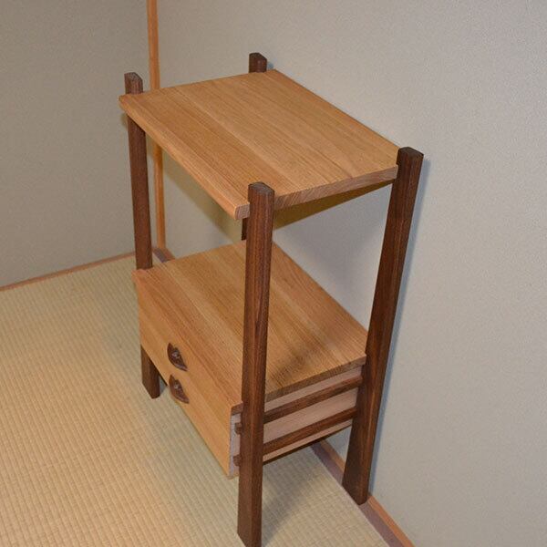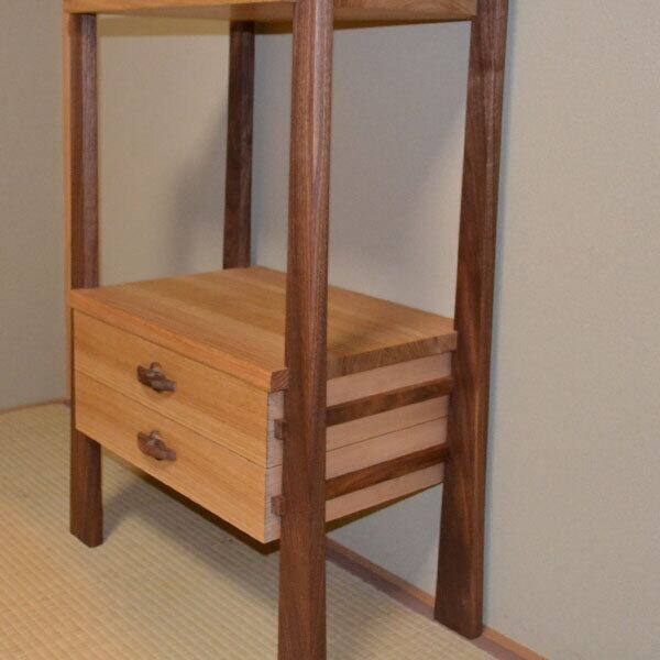 柱にウォールナット、天板と抽斗に胡桃材を使い精悍なデザインで仕上げました。
