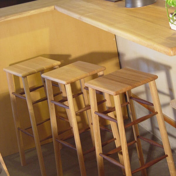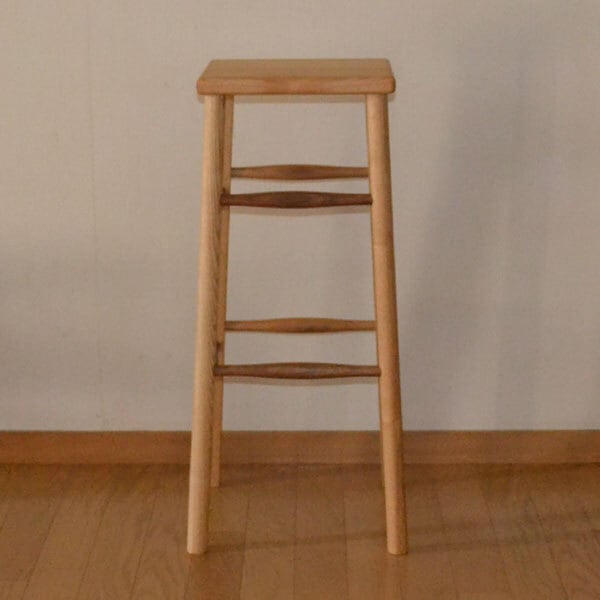 スピンドルにウォールナットを使った質感溢れる木製のハイスツール。カウンター高が約1mに適したハイスツールです。カウンターの高さに合わせ脚のカットは15㎝まで可能です。カットご希望は備考欄でお書き下さい(無料)。スタンド椅子の座高はカウンターテーブルの高さマイナス25cmから30cmが適当です。こちらの品は受注制作となります。お届けに60日程度のお時間を頂きます。