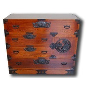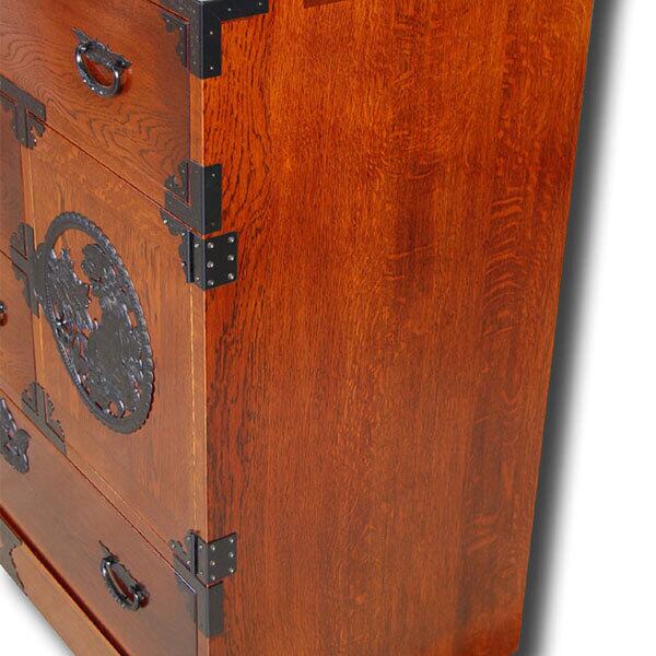 無垢楢材を使い拭き漆で仕上げた和箪笥です。楢の柾目を多用した部材には楢材特有の虎斑が現れた品です。和箪笥というと日本的なイメージですが、洋風のお部屋にも不思議なほど似合います。金物は仙台箪笥の流れを引き継いだ高級金物を使用しており、大変重厚で存在感のある価値ある品です。