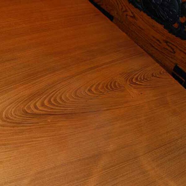 一枚板ですので天板に少々割れがありますが、千切りと埋木処理を施しています。埋木処理は良く見ても解りません。以前は木目が高級材の欅に似ることから、着色して代替品に使われることが多かった栓ですが、近年市場では希少材で、大木を見つける事は困難で、高値で推移しているのが実情です。