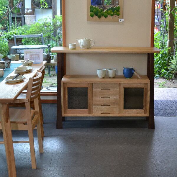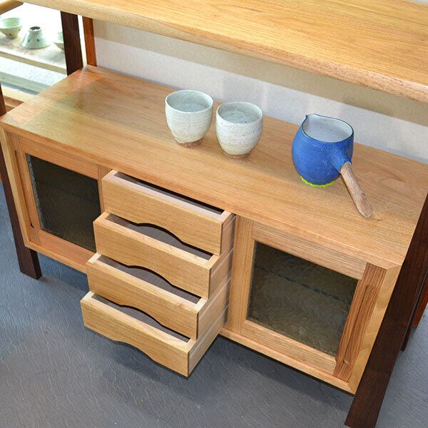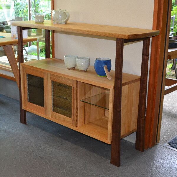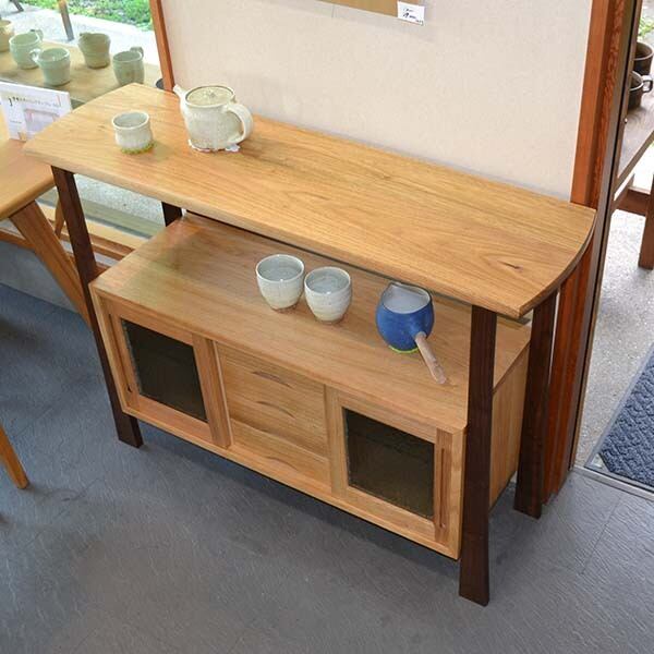 柱にウォールナット、天板と抽斗に胡桃材を使い精悍なデザインで仕上げました。飾り棚、電話台、オーディオ、花台と、使う方のアイデア次第で色々な用途にお使い頂けます。