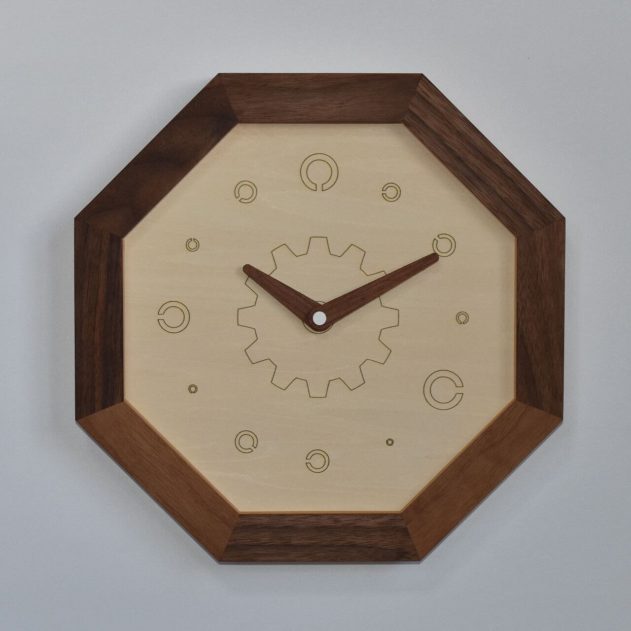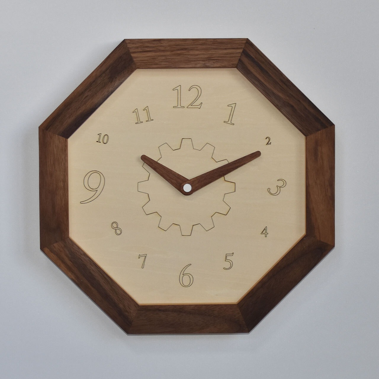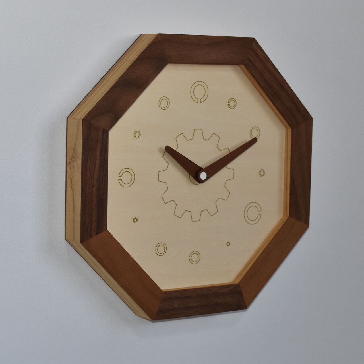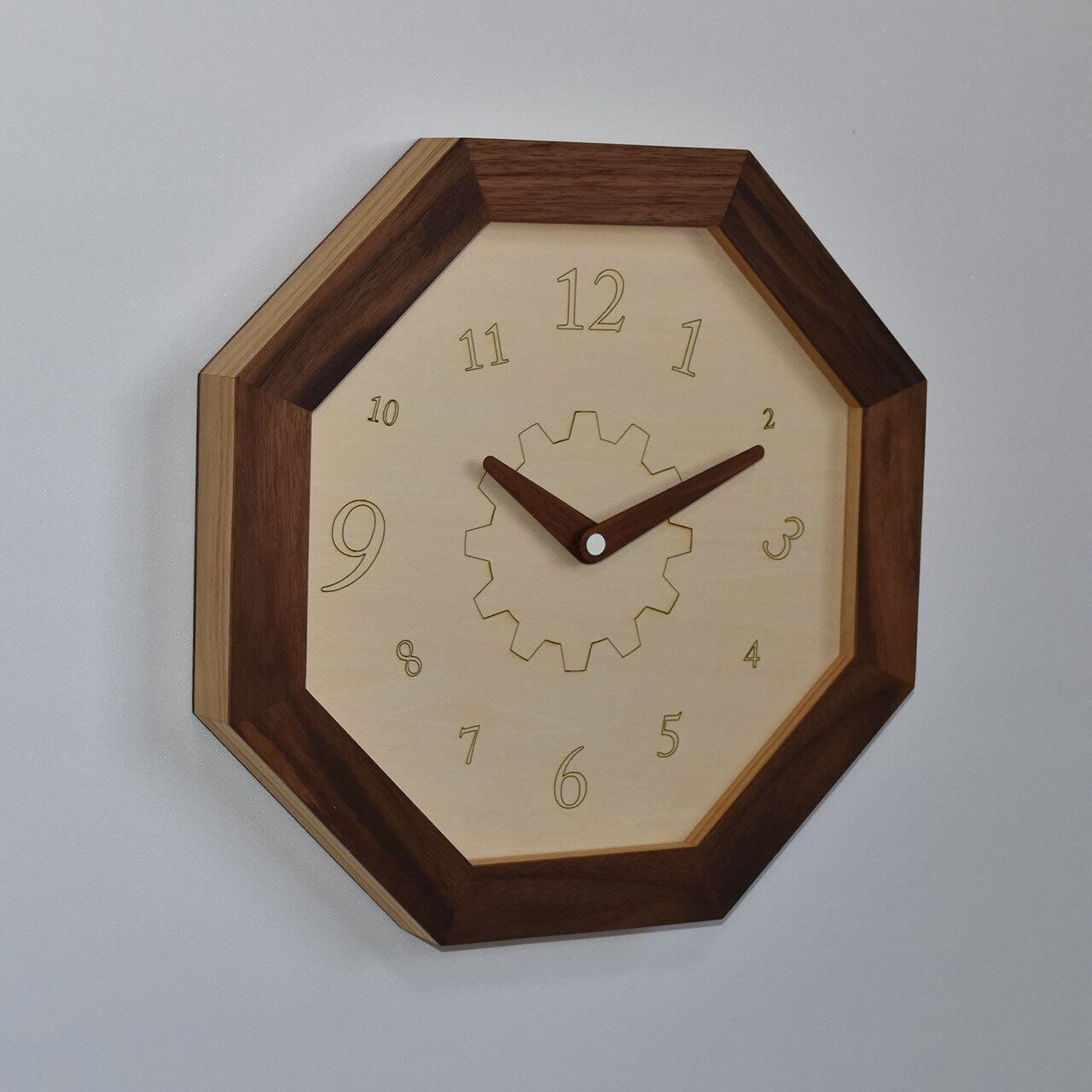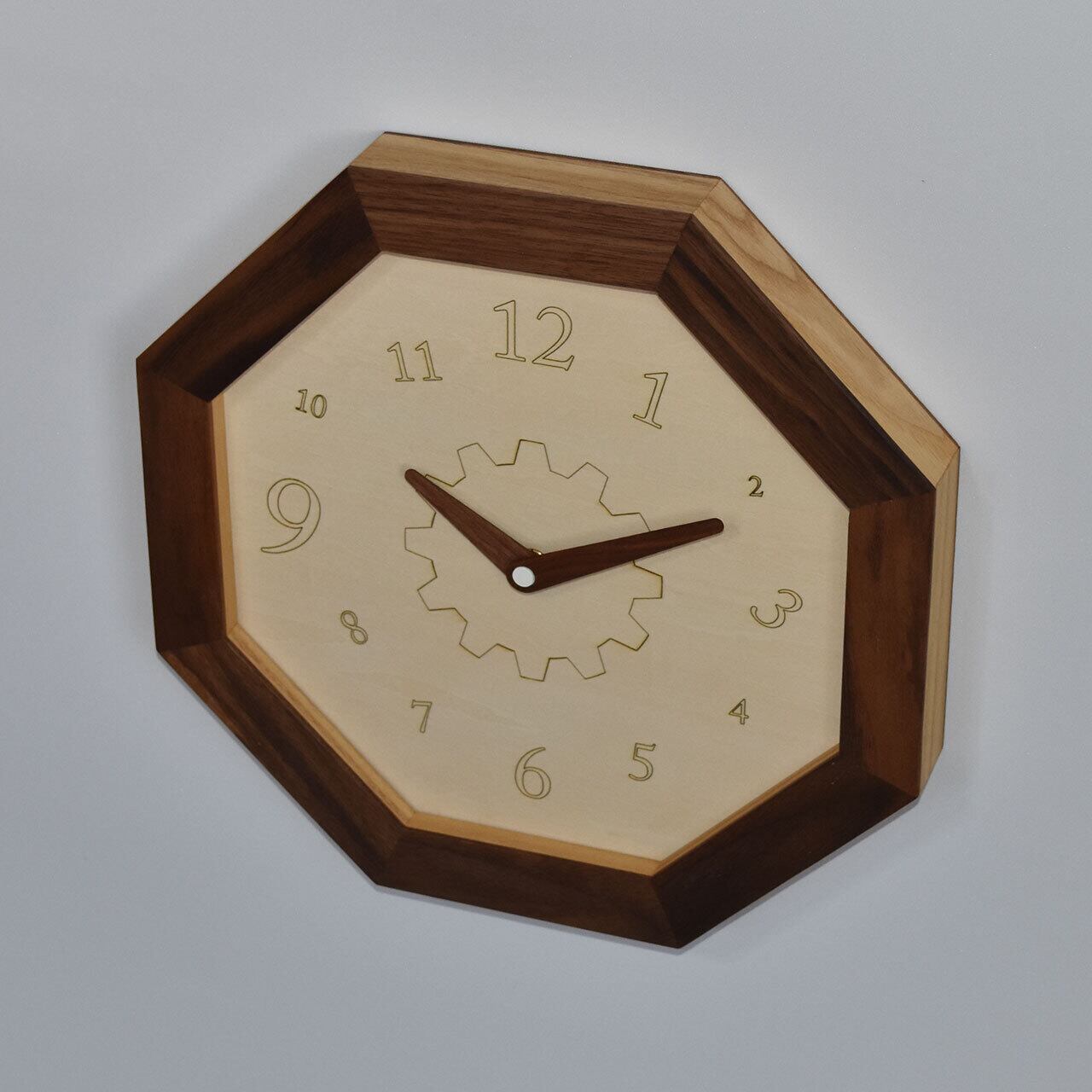 白木をウォールナットでサンドしたフレームと切り出しの針が良い質感を演出します。