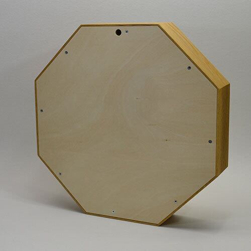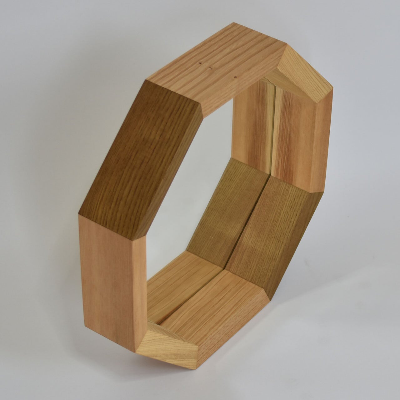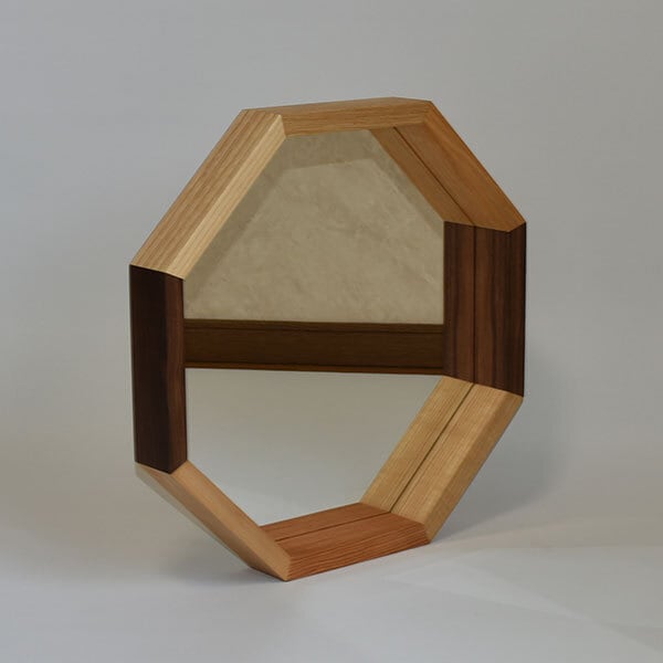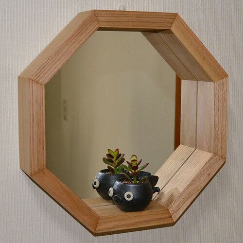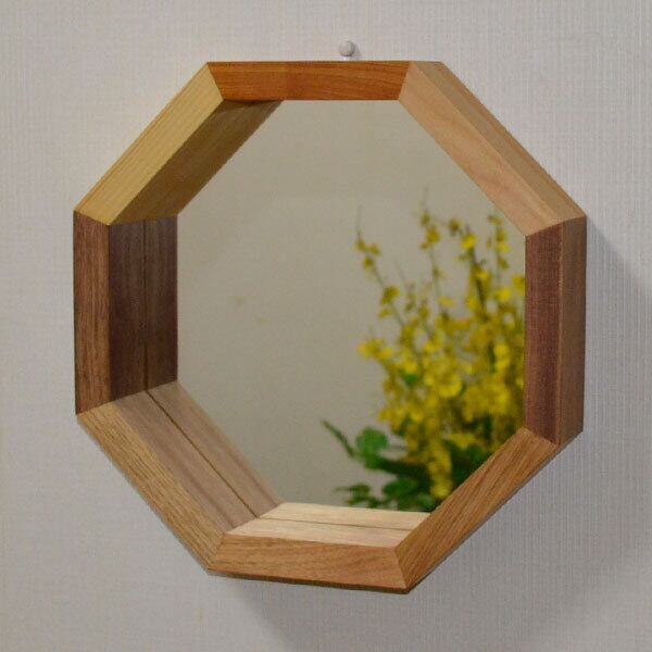 フレームの奥行が6cmあり、一輪差しや小物が置け、お部屋を素敵に演出します。八角のピースに色々な樹種を使い、浅い角度でカットされた正面小口のデザインが、さりげなく存在感を出しています。